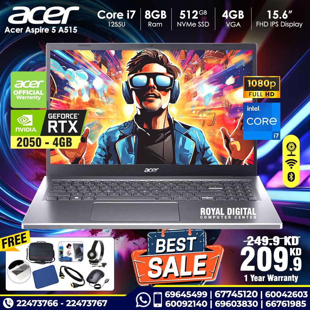 Acer Aspire 5 A515 | Core i7 - 1255U | 16GB RAM | 512 GB NVMe SSD | 4GB VGA | 15.6 inch IPS Display
